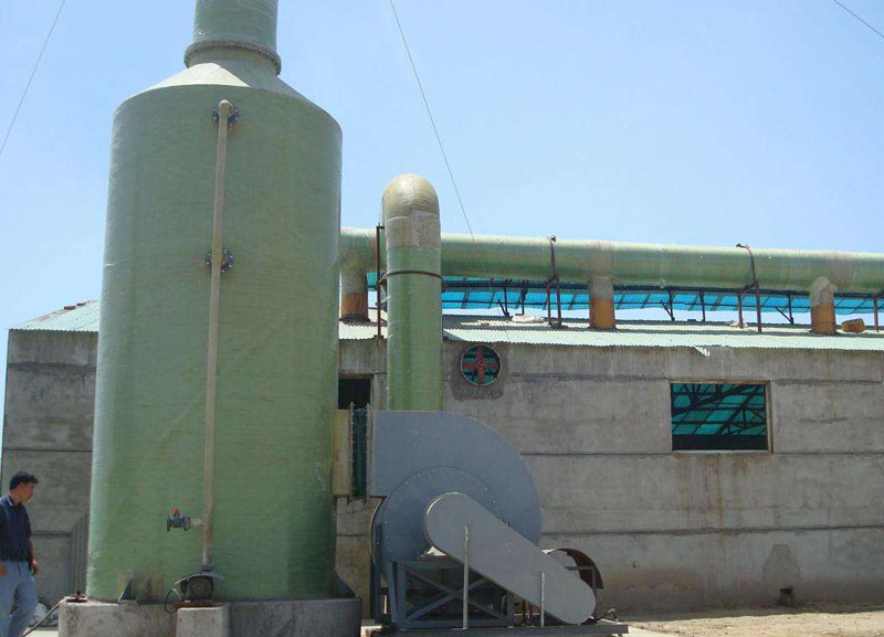 玻璃鋼凈化塔塔體為玻璃鋼整體圓筒形,無(wú)分段連接法蘭。具體結(jié)構(gòu)由貯液箱、進(jìn)風(fēng)段、三級(jí)噴淋段、除沫裝置、排氣口等組成。其特點(diǎn)是:制作方便、便于安裝檢修、強(qiáng)度高、占地面積小。噴淋形勢(shì)采用三層填料,三級(jí)噴淋使氣液更充分接觸,提高凈化效率。